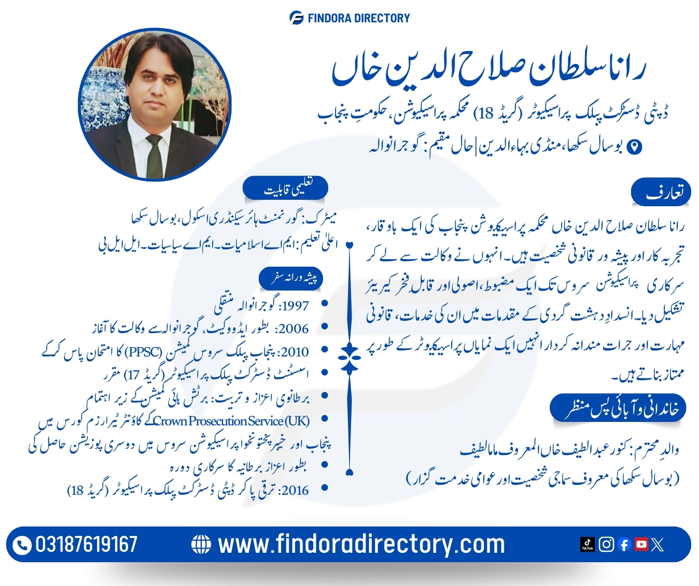 موجودہ تعیناتی: ضلع حافظ آباد بطور ڈپٹی ڈسٹرکٹ پبلک پراسیکیوٹر فرائض انجام دے رہے ہیں