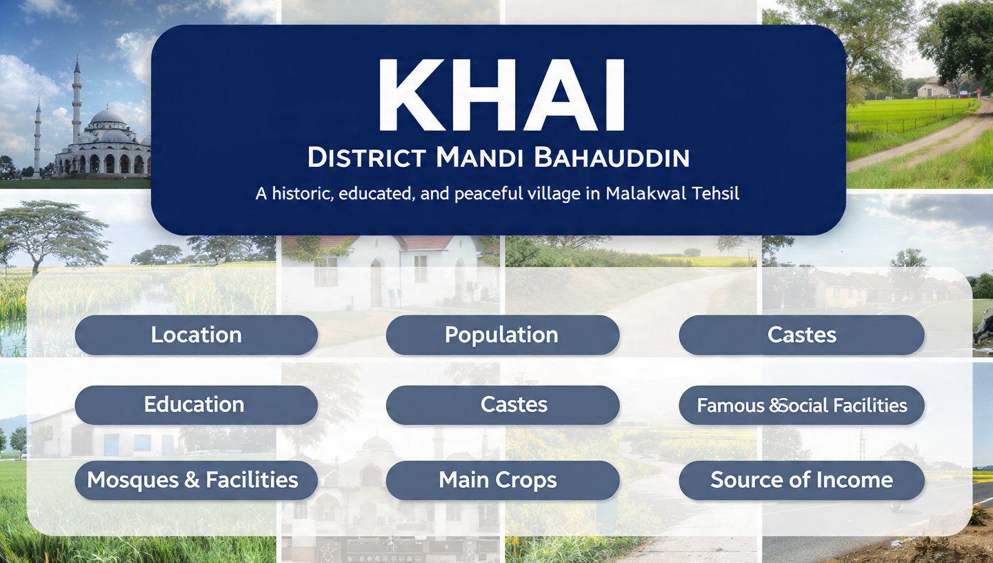 گاؤں کھائی (Khai) مین سرگودھاگجرات روڈ پر واقع ہے۔ یہ منڈی بہاءالدین شہر سے تقریباً 22 کلومیٹر جنوب مغرب کی سمت میں واقع ہے۔ یہ گاؤں کھٹیالہ شیخاں اور گوجرہ کے درمیان ہے۔ گاؤں کی سرحدیں درج ذیل ہیں: جنوب: پانڈووال مغرب: بکن ، چک نمبر 42 شمال: عیدل مشرق: کھٹیالہ شیخاں
