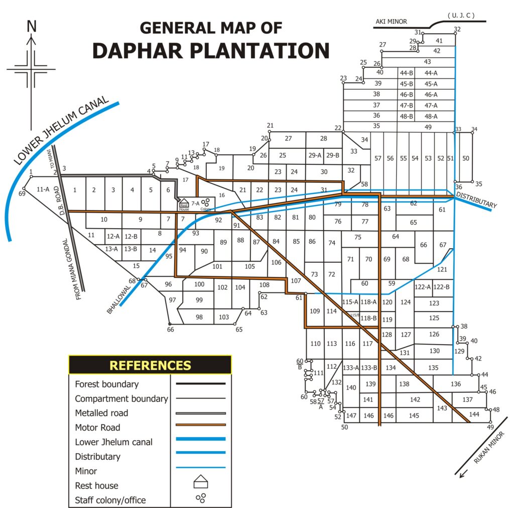Eucalyptus، Hybrid Poplar، Bakain، Semal، Kikar اور تجرباتی بنیادوں پر Bamboo بھی شامل ہیں۔ ہر سال تقریباً 300 ایکڑ علاقہ دوبارہ شجرکاری اور جنگلاتی بحالی کے تحت شامل کیا جاتا ہے۔